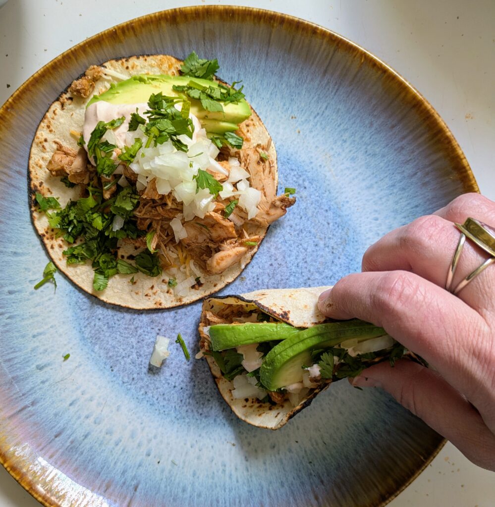 To serve: set everything out buffet style and let people build their own tacos right at the kitchen counter. It’s a week night after all and not every meal has to be aesthetic. Layer chicken with shredded cheese and top with the spiced yogurt, onion, cilantro and avocado.